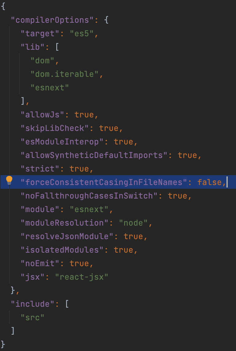 2. tsconfig.json 파일 내부 forceConsistentCasingInFileNames 를 false 로 변경해준다.